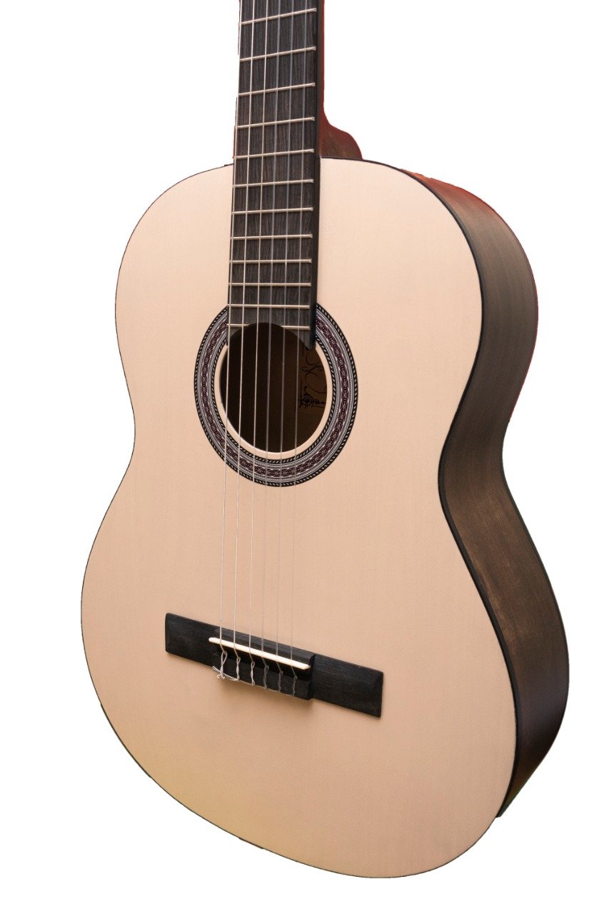 El puente y la cejilla sintética aseguran una correcta transmisión de vibración y una afinación estable dentro del rango académico. Su terminado mate lacado resalta la madera, brinda una apariencia profesional y favorece la comodidad al tocar, evitando superficies resbaladizas.