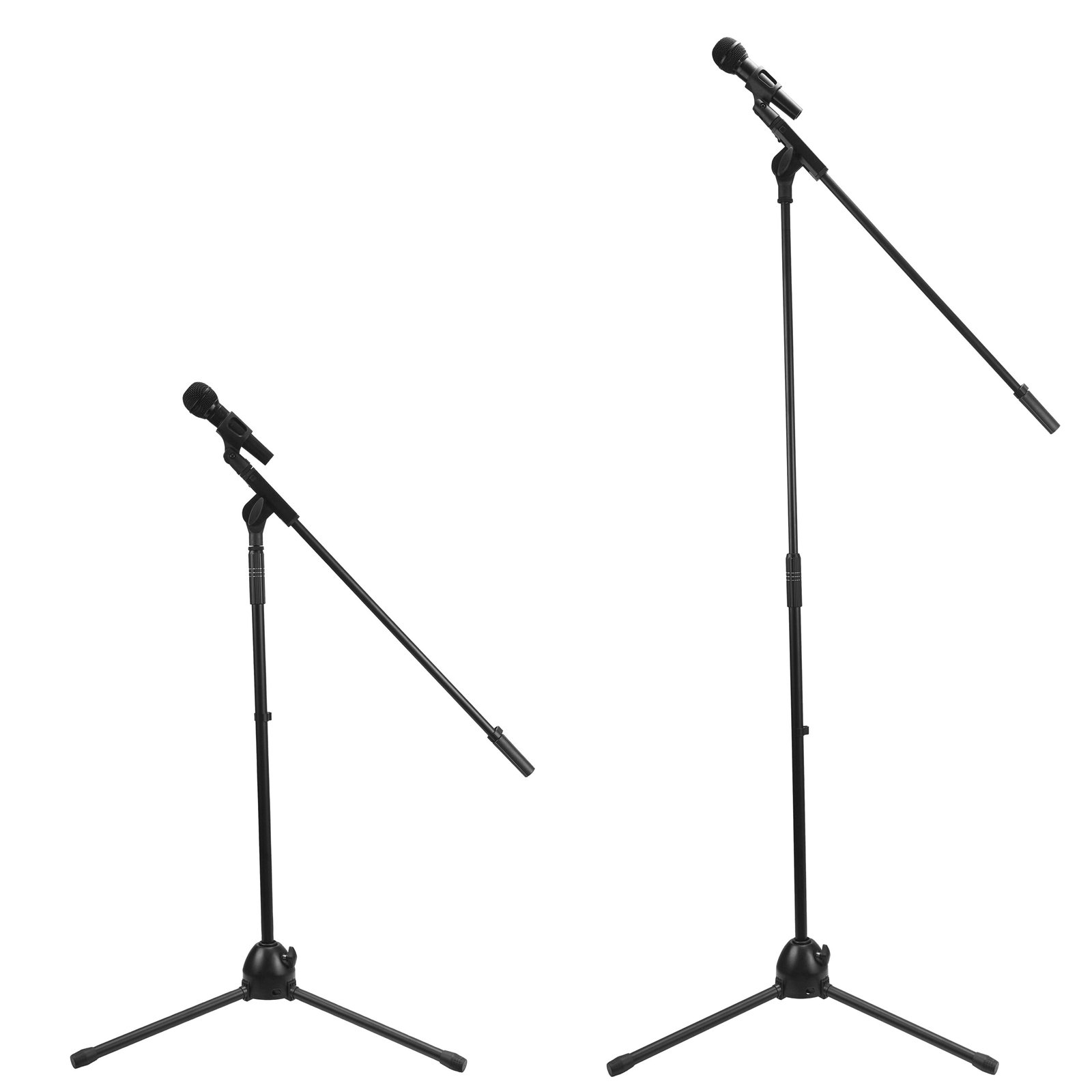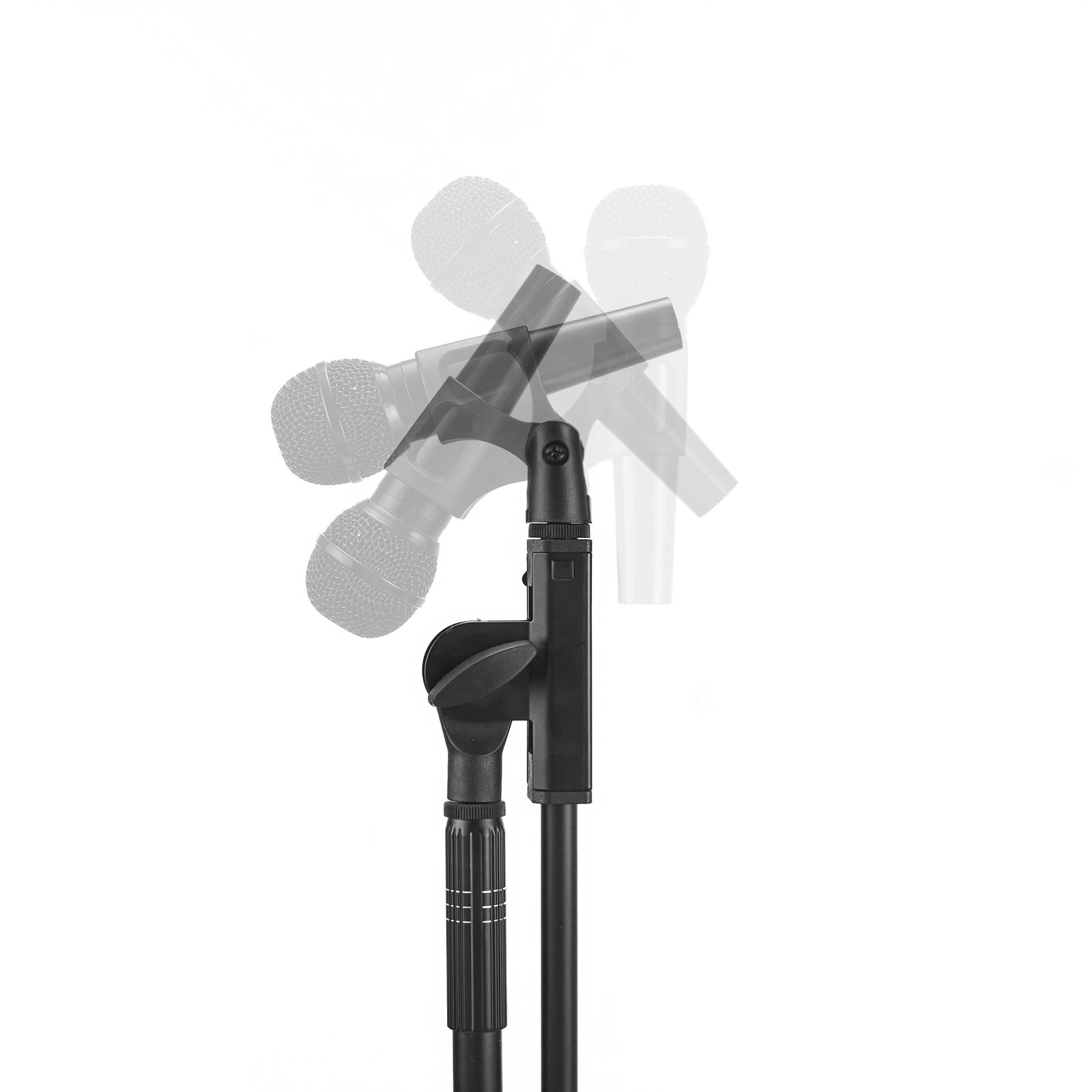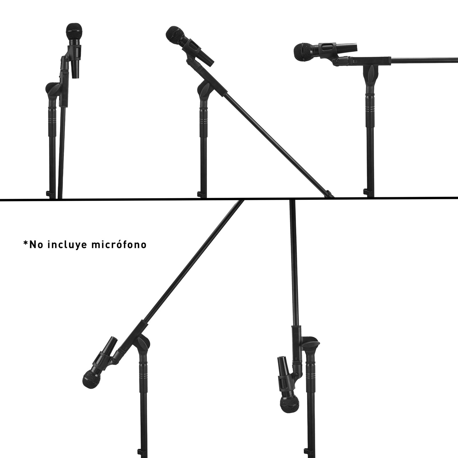 Base metálica sencilla para micrófono, ajustable en altura y con brazo articulado. Ideal para estudio, ensayo y presentaciones en vivo.